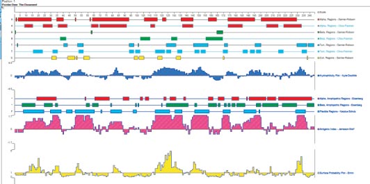 Uniprot數(shù)據(jù)庫和CBS服務(wù)器(http://www.cbs.dtu.dk/)預(yù)測信號肽、跨膜、表位等結(jié)構(gòu);EX-PASY服務(wù)器(http://www.expasy.org/tools)上的GOR4、HNN、SOPMA、nnPredict等方法。親水性、柔韌性、表面可能性、抗原表位預(yù)測、α螺旋和β折疊可以應(yīng)用DNAstar軟件預(yù)測,同時可以結(jié)合Uniprot數(shù)據(jù)中的蛋白結(jié)構(gòu)分析。MOE軟件也可以預(yù)測蛋白的結(jié)構(gòu),同時MOE軟件可以從多個角度分析蛋白的結(jié)構(gòu)特性。